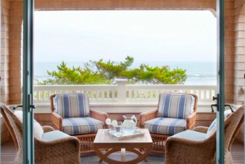 Beauty At The Beach This shingle style oceanfront home has shiplap walls, cypress beams and hand scraped cerused oak floors. The interior is furnished in a traditional seaside palette of blue and white with coral accents.